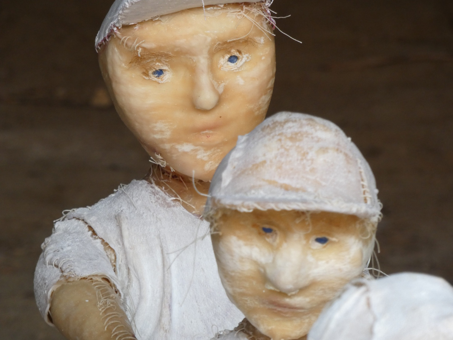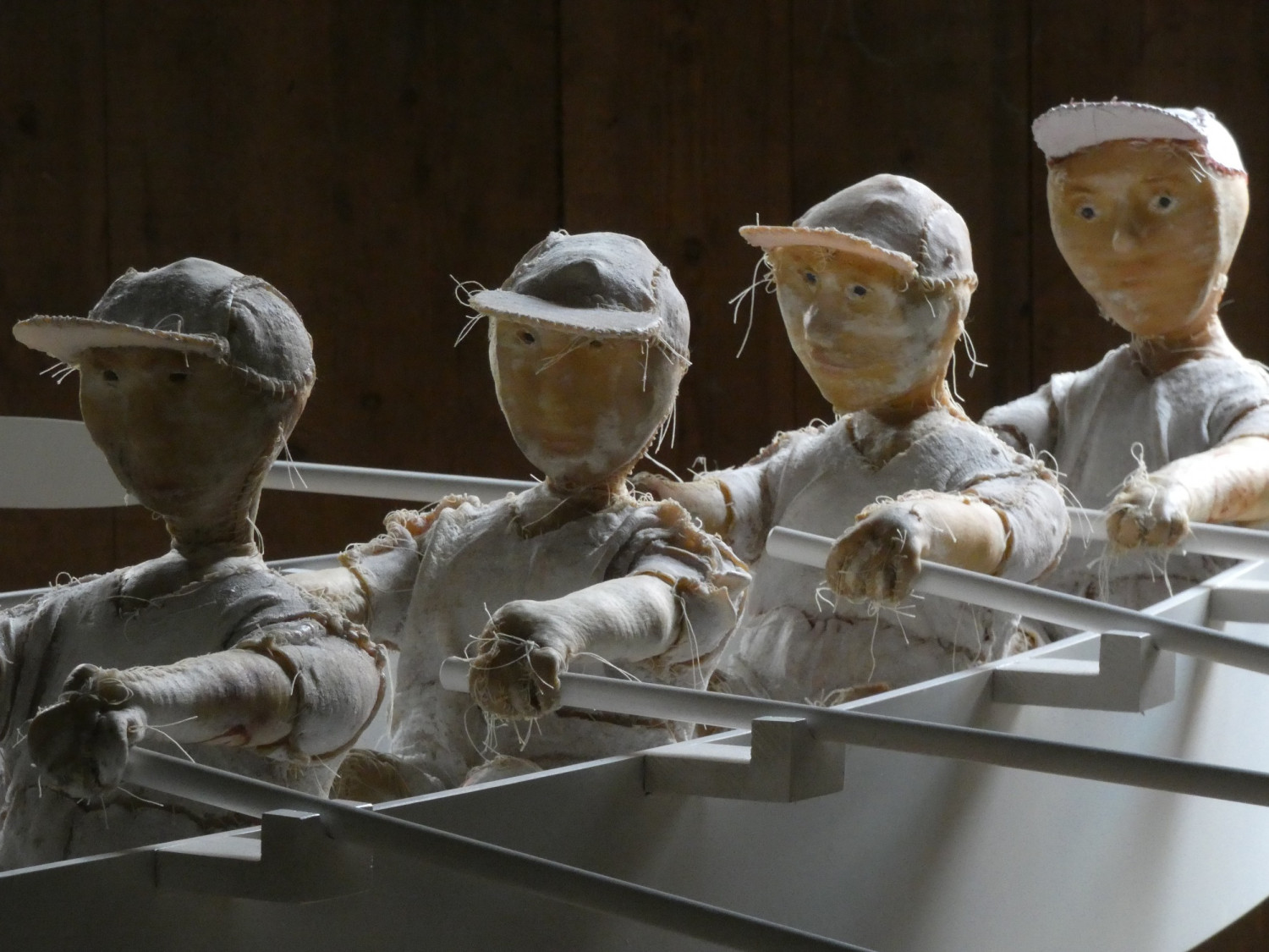 Sewing work with preserved animal hide, wooden vessel